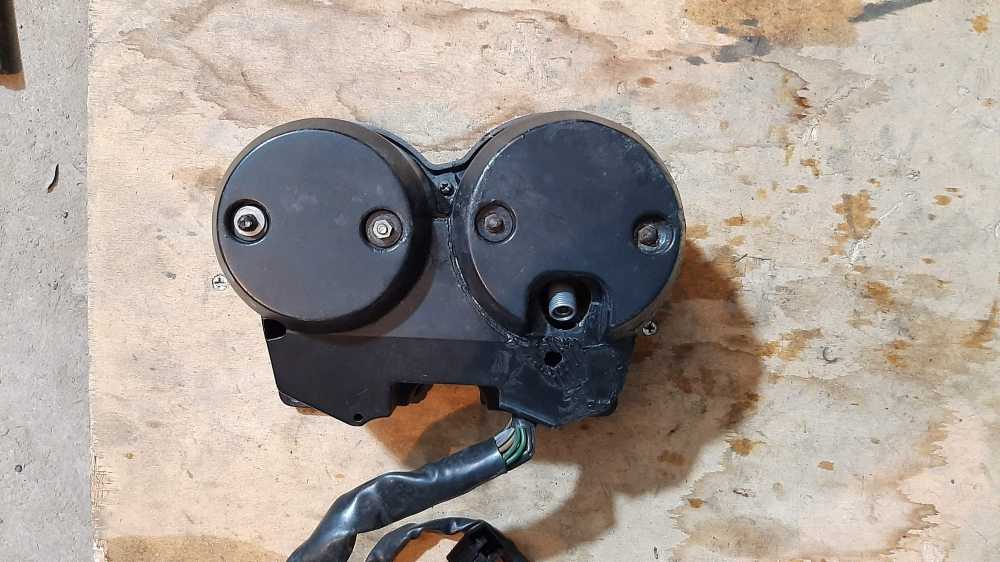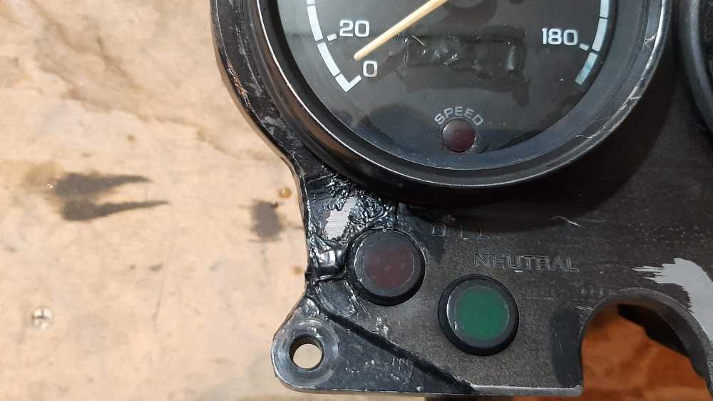 Панель приборов для honda bros (брос) 400 nc25 J/K (1988/1989 год). Корпус с дефектами, трещины на пластике паяны, трещины на силуминовом основании залиты поксиполом.