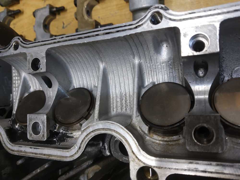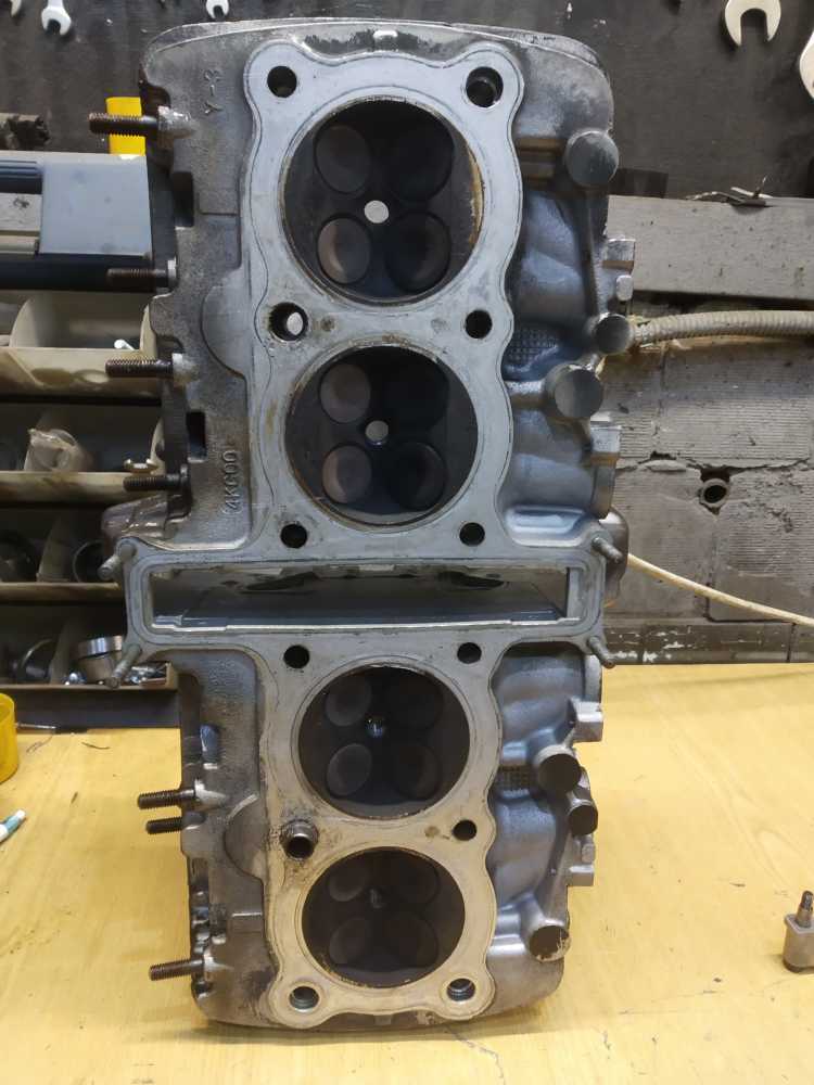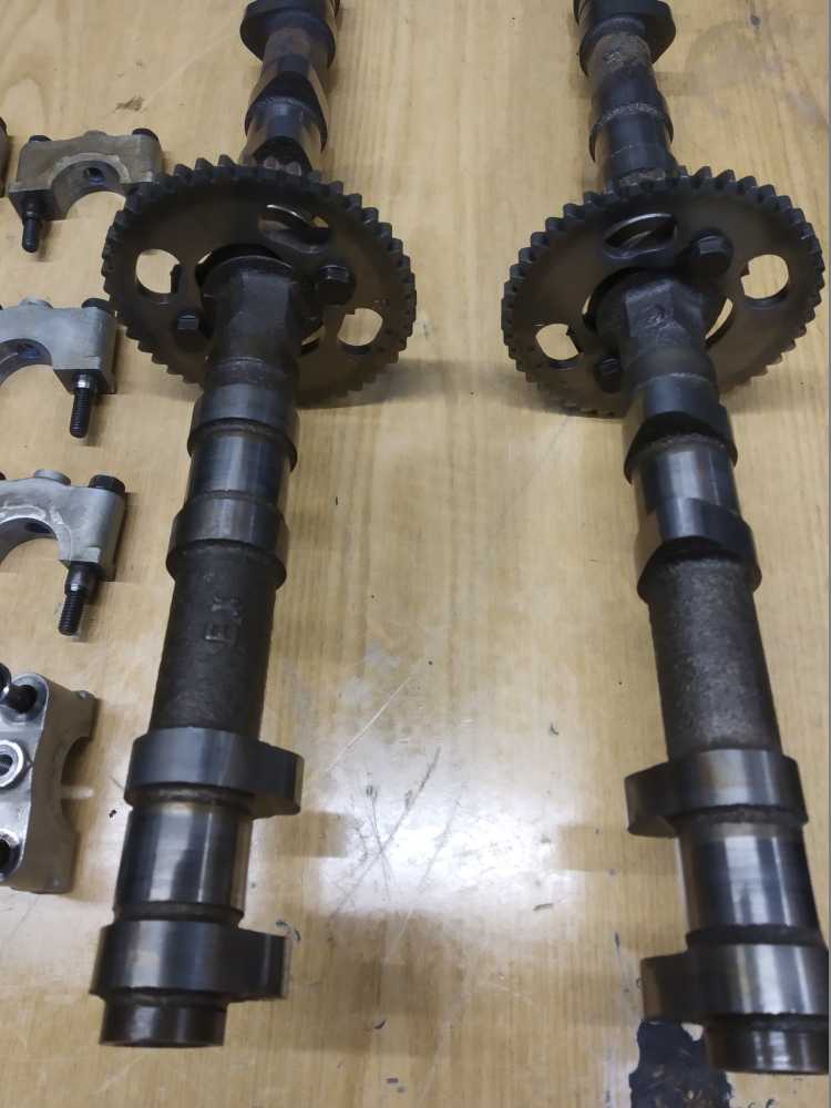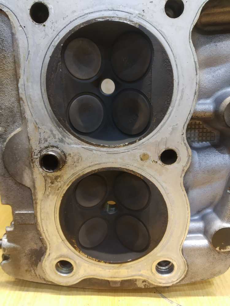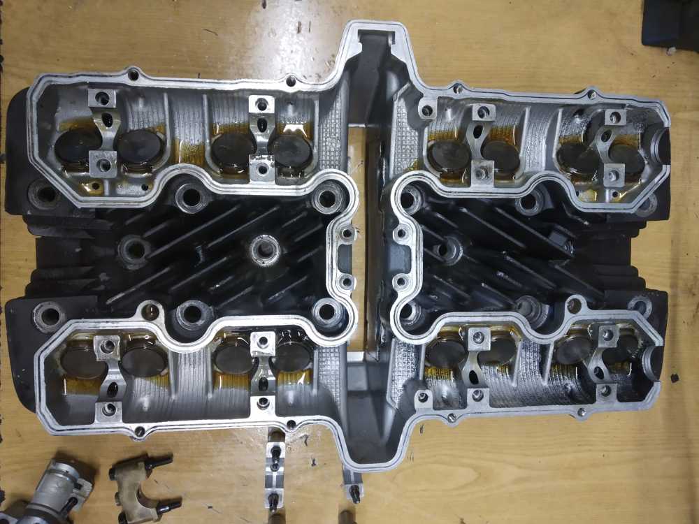 Головка блока цилиндров на Yamaha XJR1200 1994 г.в. в сборе с распредвалами. Состояние удовлетворительное. Постели со следами износа, но не развернутые. Клапана ровные. Шайбы на месте. Диаметр шеек распредвалов 24.95-24.96. Повреждены ребра охлаждения, см. фото. Плоскость не проверялась.