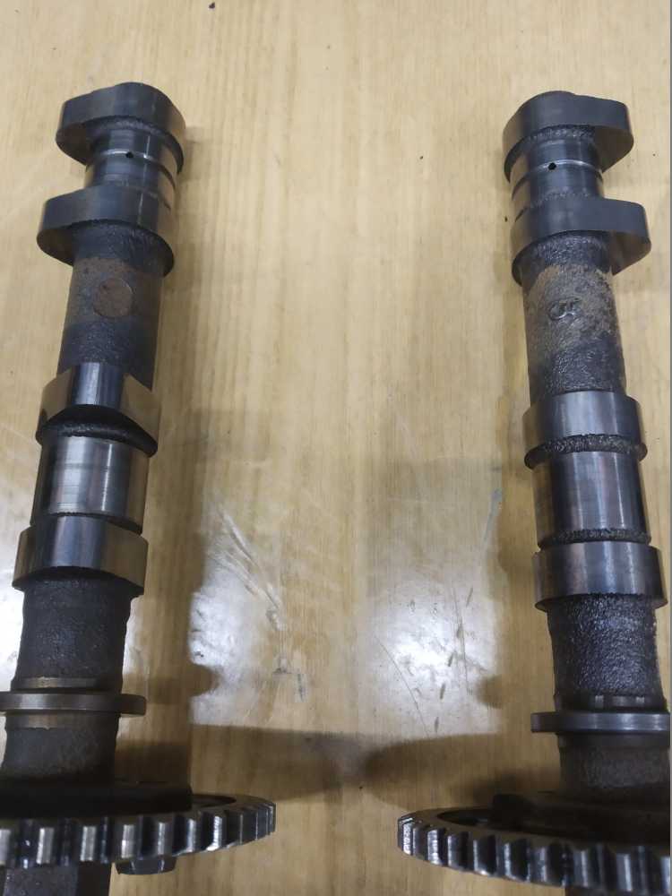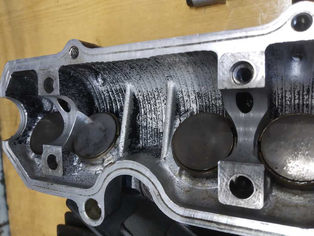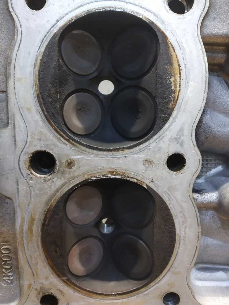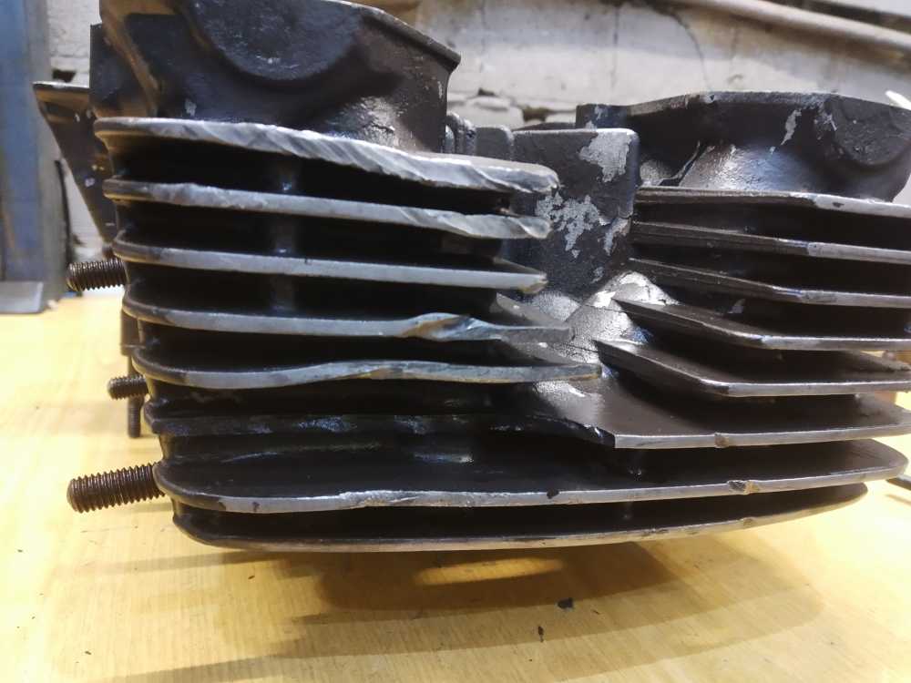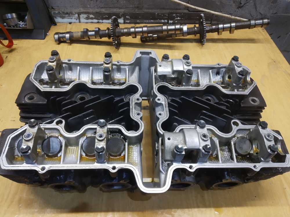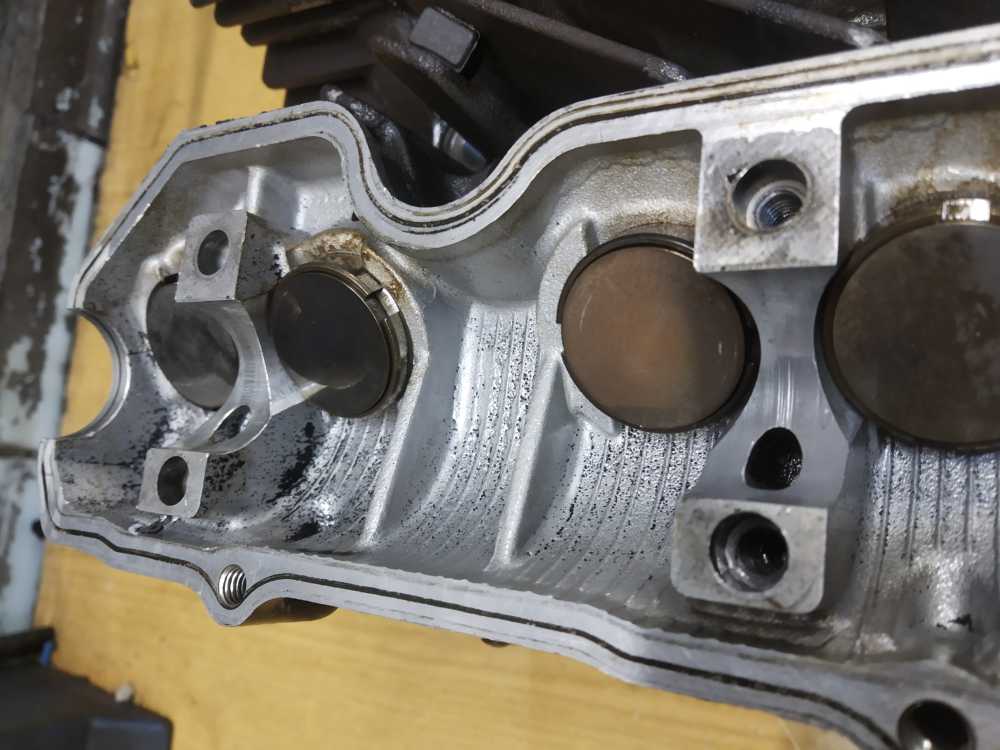 Головка блока цилиндров на Yamaha XJR1200 1994 г.в. в сборе с распредвалами. Состояние удовлетворительное. Постели со следами износа, но не развернутые. Клапана ровные. Шайбы на месте. Диаметр шеек распредвалов 24.95-24.96. Повреждены ребра охлаждения, см. фото. Плоскость не проверялась.